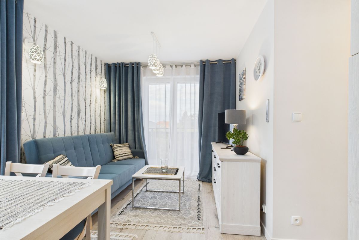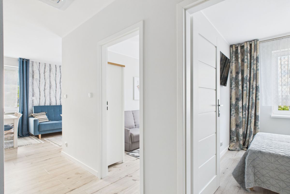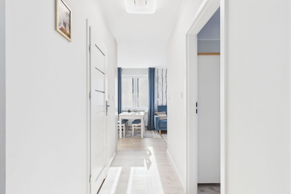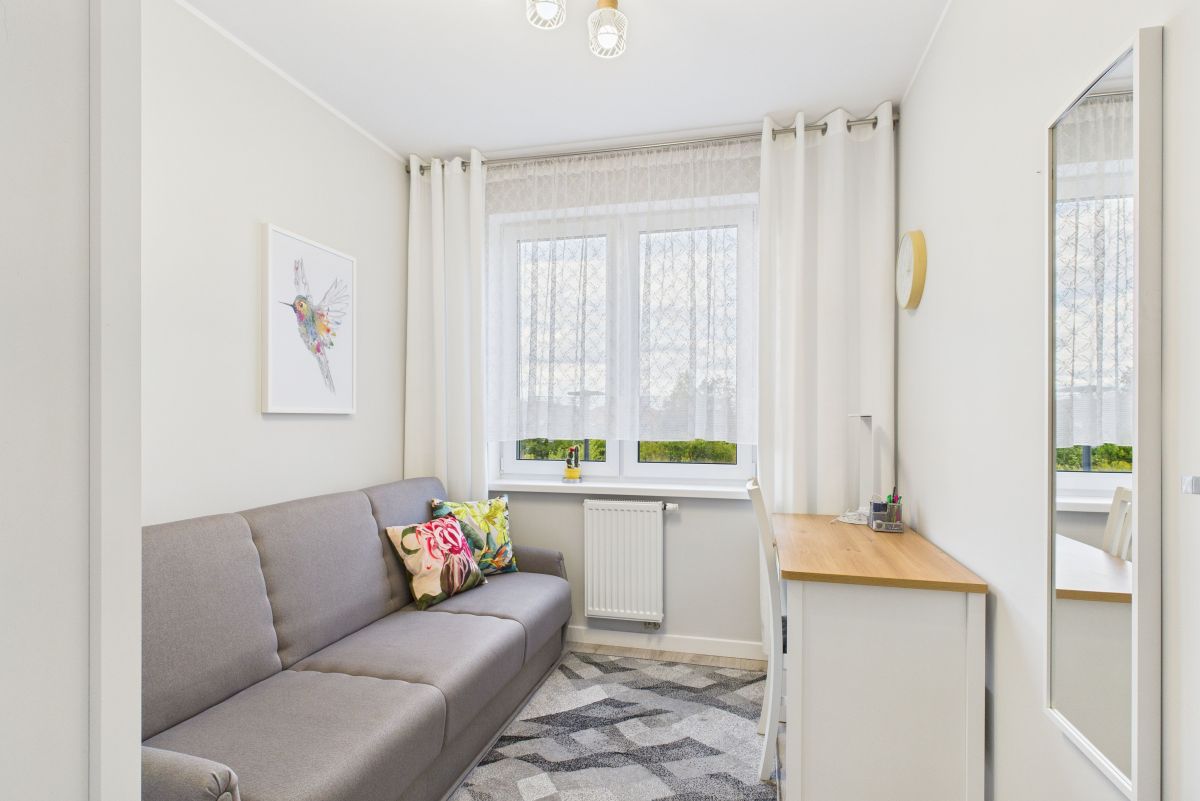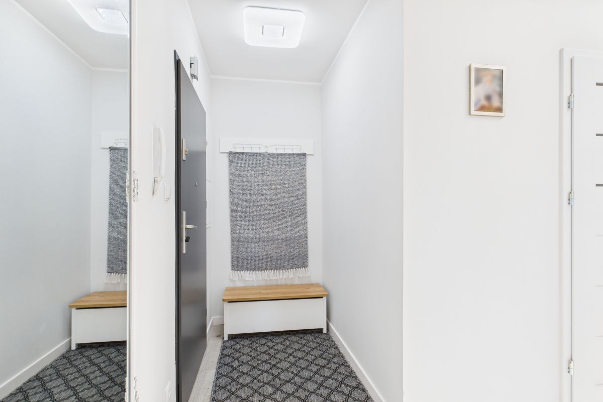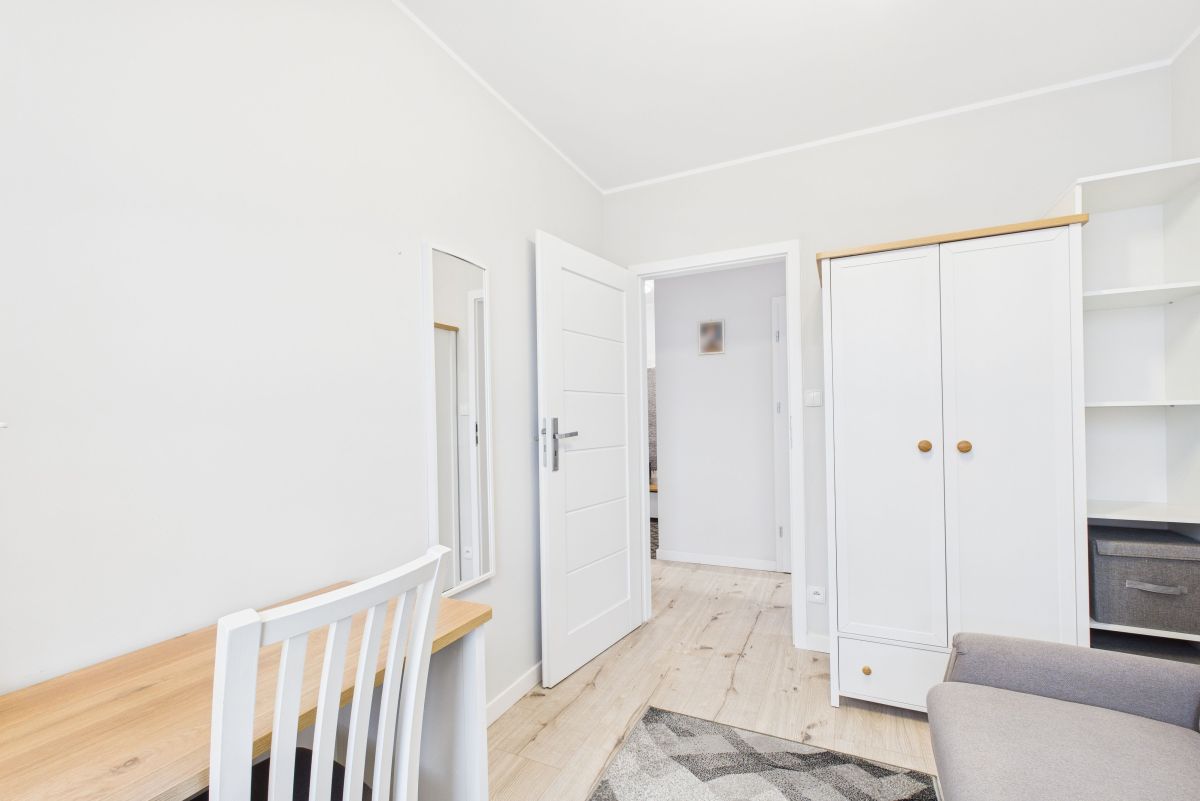 Salon z aneksem kuchennym, wygodna sypialnia, mały pokój typu gabinet lub dla gości i spora łazienka. Pełne wyposażenie kuchni i łazienki w sprzęty AGD. Z salonu wyjście na balkon. W łazience prysznic i pralka. Przestronny przedpokój z zabudową.