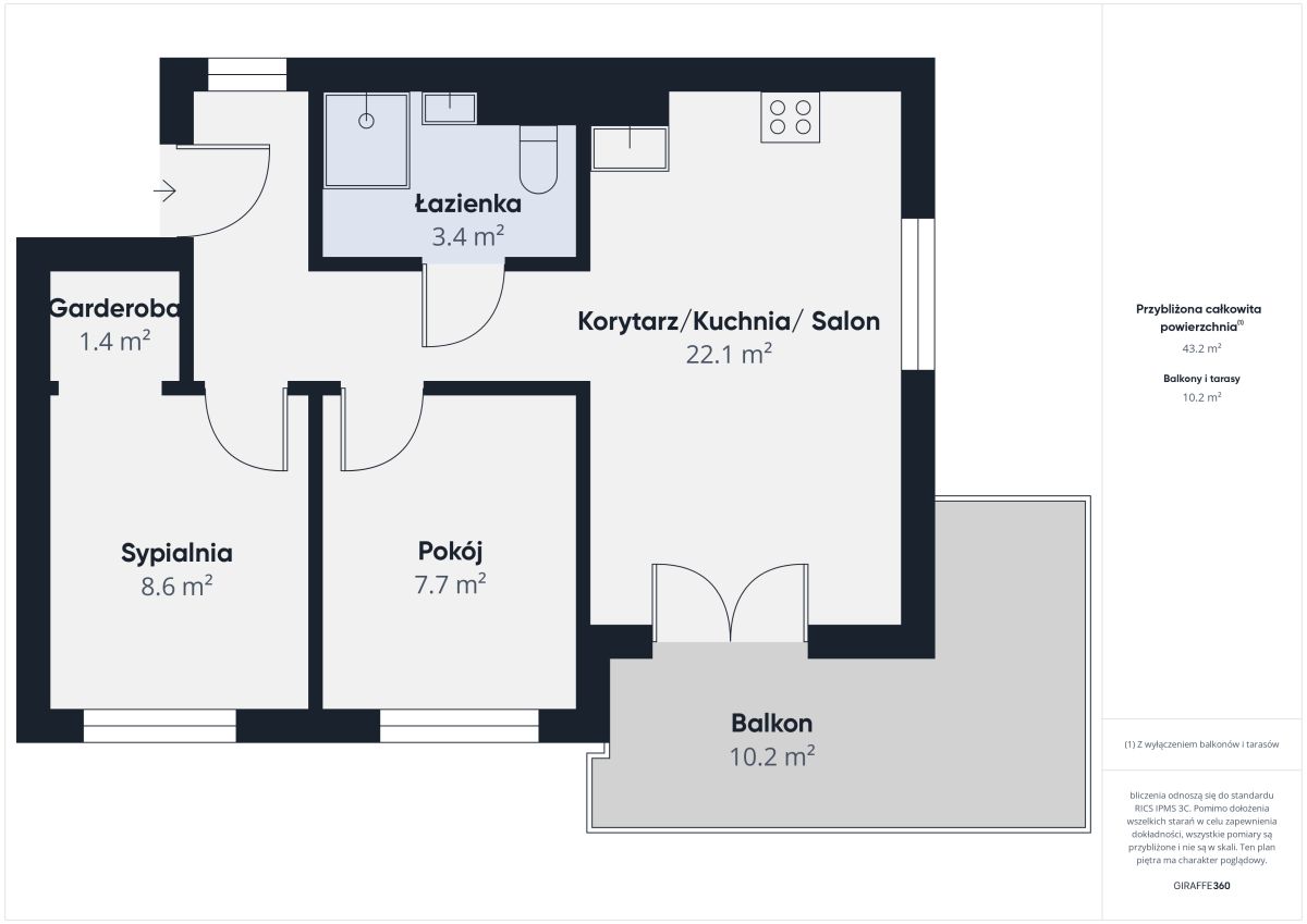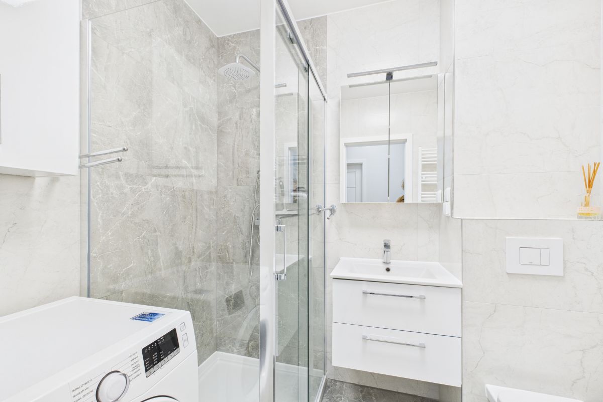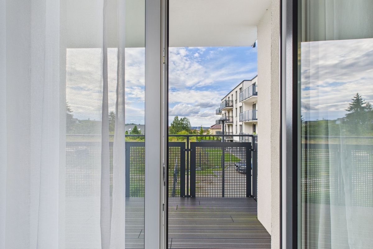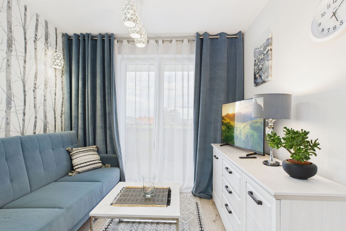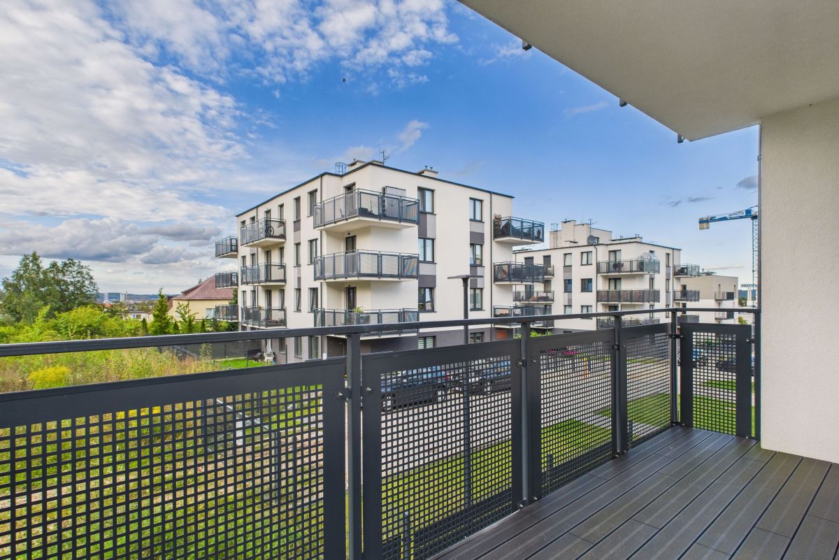 Salon z aneksem kuchennym, wygodna sypialnia, mały pokój typu gabinet lub dla gości i spora łazienka. Pełne wyposażenie kuchni i łazienki w sprzęty AGD. Z salonu wyjście na balkon. W łazience prysznic i pralka. Przestronny przedpokój z zabudową.